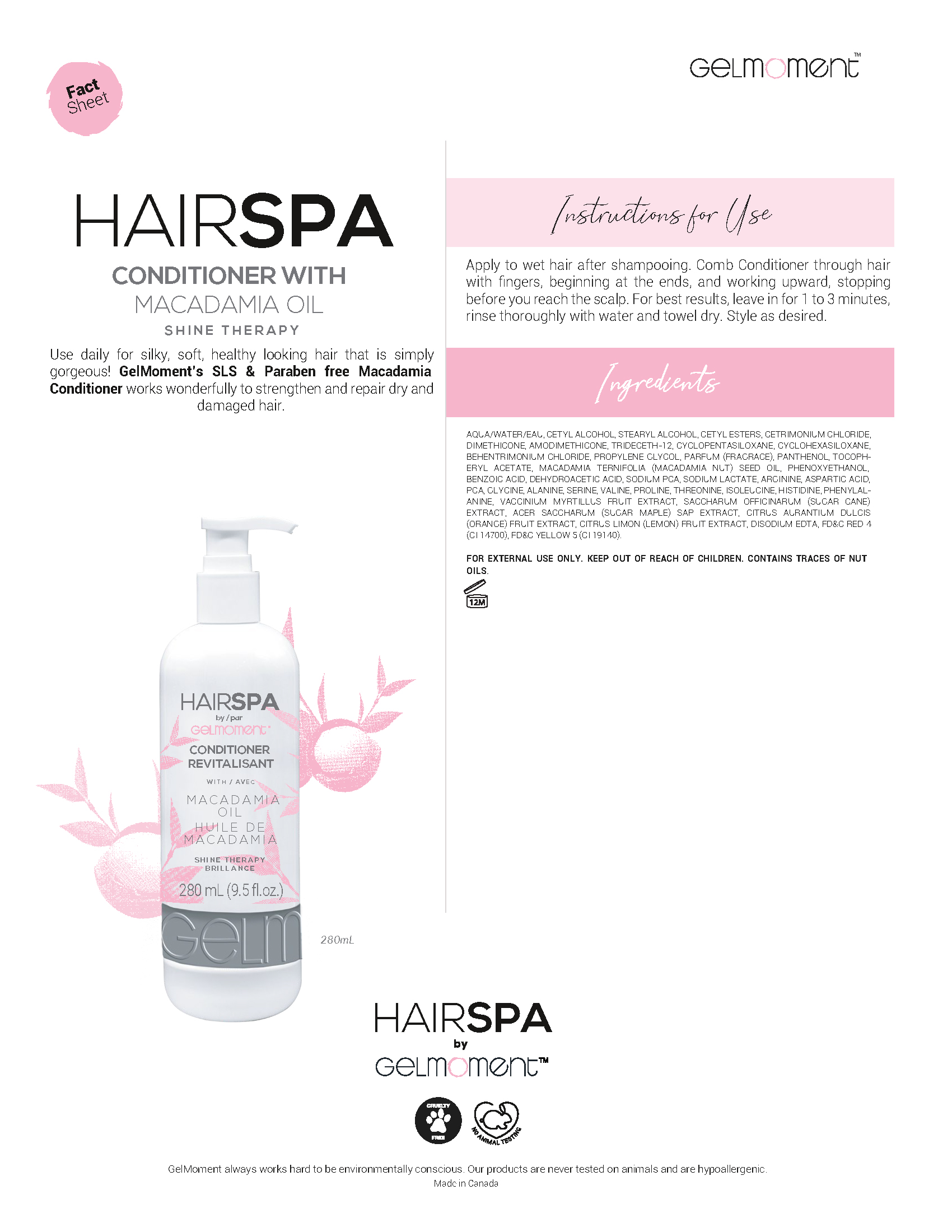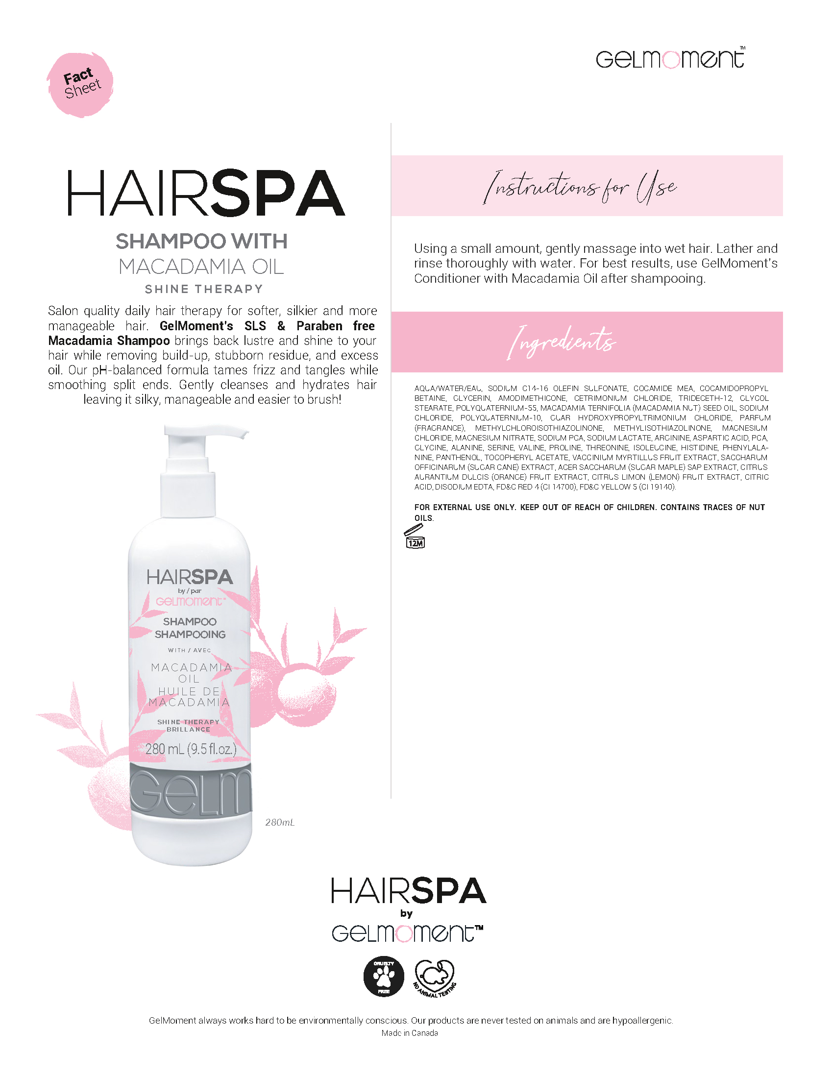 Salon quality daily hair therapy for softer, silkier and more manageable hair. GelMoment’s SLS & Paraben free Macadamia  Shampoo brings back lustre and shine to your hair while removing build-up, stubborn residue, and excess oil. Our pH-balanced formula tames frizz and tangles while smoothing split ends. Gently cleanses and hydrates hair leaving it silky, manageable and easier to brush!